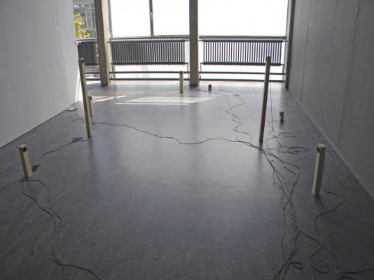 The second part of the project is a living sound sculpture. Six singers are grouped in pairs. The singers voices are treated as threads, with the principle of two voices holding one thread on its two ends and a system of warp and weft threads. The performers walk through corridors, staircases, elevators and other transitory places. While constantly singing and remaining in relation towards each other. It is as if they would spread and adjust the structure of the fabric into all those locations. Sound fabric is bending, stretching and curving through the noise of the hallways, between the public, sometimes almost unnoticed, yet present all the time.